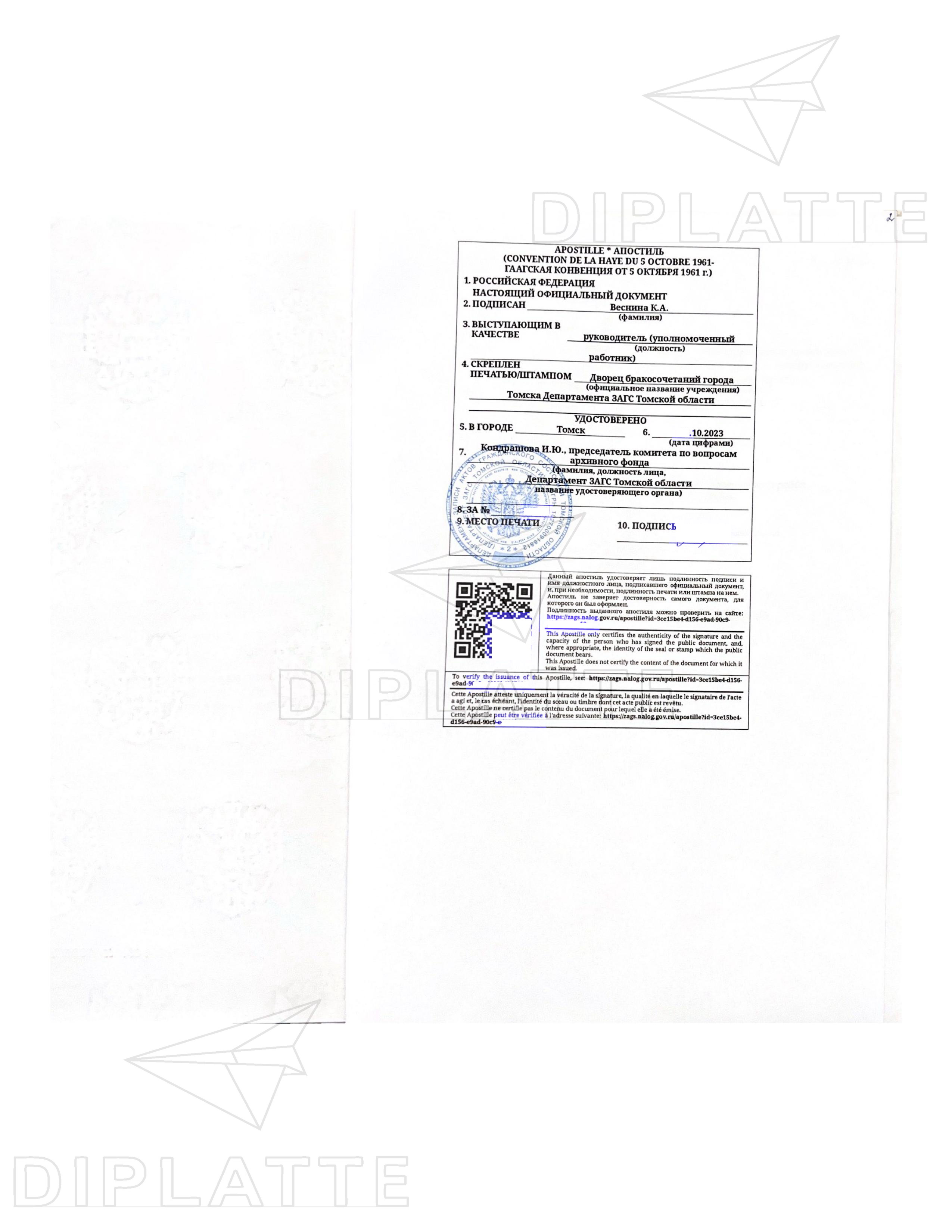 Если вам надо апостилирование свидетельства о заключении брака, то надо сразу нас предупредить об этом и мы сделаем за дополнительную плату (на январь 2025 года — 10 000 рублей). Также при необходимости вы можете купить на Диплатте свидетельство о рождении и другие виды свидетельств ЗАГСа.